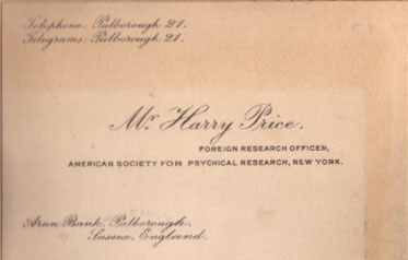 Harry Price later credited the Stella C. séances as beginning the work of his own psychical research organisation which would later come to be known as the National Laboratory of Psychical Research. The first series of Stella C. sittings, thirteen in all, continued until October with impressive results and Price's report on the phenomena was published the following year in the Journal of the American Society for Psychical Research. August 1923 also saw Price take part in an International Congress for Psychical Research in Warsaw where he had the opportunity to sit with a number of mediums, one of whom, Jean Guzik was exposed as a fraud the day after his sitting with Harry Price. However, on his return to England the link with his numismatic interests of his early years was broken when his collection of rare coins was stolen from a display in Pulborough Church and he never returned to this field again. Compared with the highs of 1923, the following year was something of a fallow one for Price. He made an attempt to interest the B.B.C. with a scheme for broadcasting a series of telepathy experiments, but it was not until 1925 that Harry Price's reorganisation of British psychical research began to take on permanent shape. He spent the opening month on a Scandinavian lecture tour as a replacement for Conan Doyle who had been advised not to attend due to a warning received during a séance. Price's reputation in psychical matters had increased now to the point that he was able to open an International Psychic Exhibition in Copenhagen on the 10th January 1925 and also in Copenhagen was received as the guest of the Danish Rifle Club. Back home Price saw the realisation of his ambition, made at the outbreak of the Great War, finally come to fruition when on 25th March he chaired a meeting at the Royal Societies Club to inaugurate his National Laboratory of Psychical Research. At this event the future Council of the organisation was formed and soon after Price arranged to rent the top floor of the London Spiritualist Alliance's headquarters at 16 Queensbury Place, South Kensington as his centre of operations. The rest of 1925 proved to be a busy time. In the months following the inauguration, Price began putting his laboratory together and purchasing equipment and materials to set up what he would later describe as a "model psychic laboratory". Despite this, he returned twice to Austria for further sittings with Willi Schneider, on the second trip at the end of October meeting Willi's brother Rudi for the first time. In addition to all this, on the strength of his Stella C. report, which had been published in book form by Hurst and Blackett at the beginning of the year, in June Price had been appointed Foreign Research Officer for the American Society for Psychical Research, a post which he was to hold until 1931 when it was abolished as part of internal changes within the organisation. This appointment resulted in many contributions by Price to the A.S.P.R.'s Journal over the next few years.