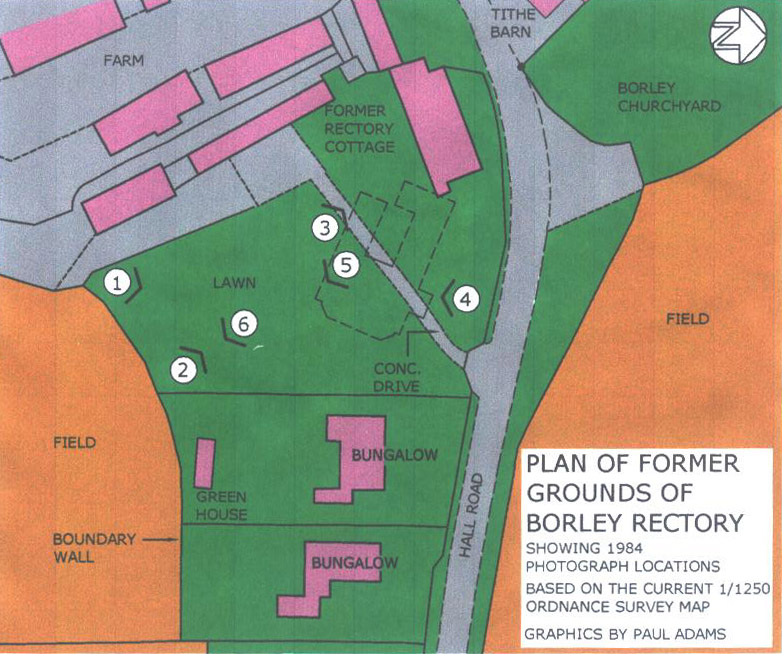 This page is a companion to the Borley Rectory in Modern Photographs essay that shows the site of the former Rectory building and its grounds as it is today. Richard Lee-Van den Daele, who contributed to the late Ivan Banks' book The Enigma of Borley Rectory in connection with Captain Gregson and his sons, has very kindly allowed photographs which he took on the site of Borley Rectory in 1984 to be included on the website, and this short article locates Richard's pictures on a contemporary site plan along with some additional historic photographs to put them into context. Richard Lee visited Borley in July 1984 and took a series of photographs on the former Rectory site with the permission of the landowners who were far more amenable then towards visitors than they are now. It must be stated that the old Rectory grounds are private property and anyone going to Borley today should respect this. The six photographs are located on the plan of the site below which is based on the current 1/1250 Ordnance Survey map. The outline of Borley Rectory is indicated, although nothing remains today, the only building on the site from the time that the Rectory was standing is the Rectory Cottage which has been heavily altered and extended.