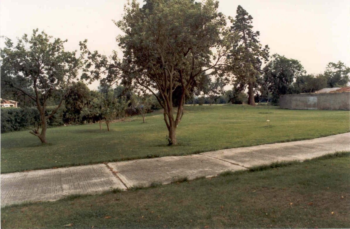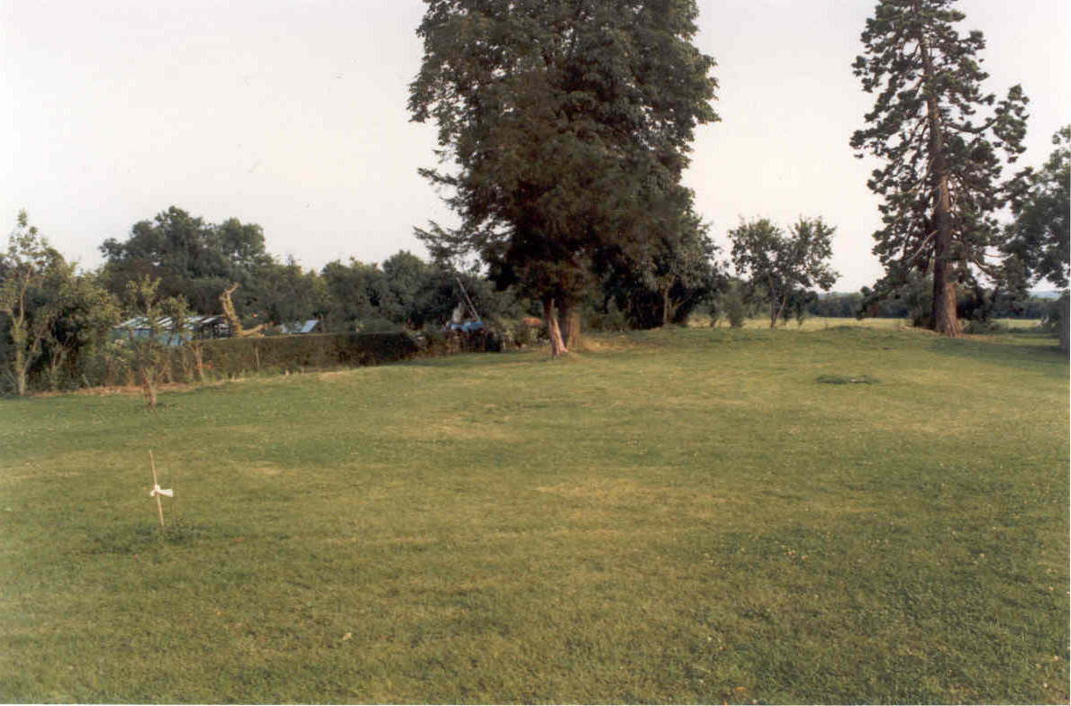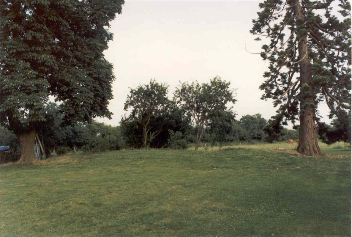 Photograph 5 & 6 (Below) Looking South-East across the former Rectory lawn to the start of the Nun's Walk. The line of the Nun's Walk went from approximately near the larger of the two trees in the centre of the photograph across to the greenhouse on the left and then continued parallel with the boundary wall of the Rectory grounds bordering the large upper lawn. The second photograph is taken looking towards the copse of trees from which it appears Mr. V.C. Wall of the Daily Mirror saw the mysterious light appear in one of the rooms of the first floor rooms in June 1929. The Nun's Walk is impossible to photograph in its entirety today as it crosses the rear of the gardens of the bungalows built on the Rectory grounds.
