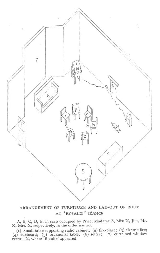 The 'Rosalie' case first appeared in print in Harry Price's Fifty Years of Psychical Research which was published by Longmans, Green and Co. in 1939. The following is the complete text of Chapter VIII of Harry Price's book in which he describes his experiences at the sitting that he attended in December 1937 and includes the diagram of the séance room included in the chapter, as well as the Frontispiece photograph which is referred to in the text. In the three proceeding chapters, Price had dealt with the subject of physical phenomena in the séance room and had written about three investigations into this subject in which he had been personally involved - the Schneider brothers, Mina Crandon or 'Margery', and Stella C. p.130