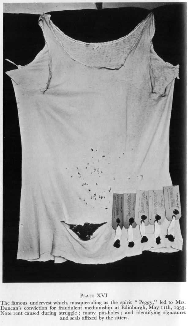 A distinguished Scots lady, Miss Esson Maule, had a séance with the medium and arranged that some well-known Edinburgh people should be present. The meeting was held on January 6th, 1933. The usual "spirits" materialised, and towards the end of the sitting "Peggy" was seized by Miss Maule at the same time as someone switched on a light. A terrific struggle between Miss Maule and Mrs. Duncan took place. It was a case of "pull Devil, pull baker," with "Peggy" as the prize. Miss Maule ripped "Peggy" up the middle and got her arm through it, but ultimately had to leave go. The police were called and the case created a considerable sensation. In an affidavit sworn by several of the sitters it is stated that "Peggy" was a woman's stockinette undervest. Mrs. Duncan was persuaded to hand this over, and the tear where Miss Maule's arm went through it is plainly visible. The vest was sealed with the signatures of most of those present, and I have been promised it for my museum of "psychic" curiosities.