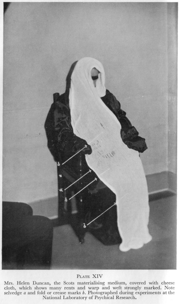 So now the reader knows what ghosts are made of ! Every spiritualist was deeply impressed with all this handing around of teleplasm and the pirouetting phantoms, and a Dundee doctor brought Mrs. Duncan across the Border to London to exhibit her powers to the faithful at one of the spiritualist societies. It happened that the National Laboratory Rooms comprised the top flat of the building in which the spiritualists' test was carried out. Great preparations for the séance were made and a number of persons, including Sir Oliver Lodge, were present. Needless to say, I was not invited! Looking over the banisters as they trooped up the stairs, I could not help wondering what the afternoon would bring forth. I was soon to be informed, however, as very shortly the floor of my office reverberated to the "Hurrahs!" and "Bravos!" of those beneath, and I knew that Mrs. Duncan had received the cachet of the spiritualists. The cheese-cloth mania had started. For the next six months Mrs. Duncan sat regularly with the spiritualists, a substantial fee being charged for the privilege of' seeing the signs and wonders alleged to occur. Her miracles were written up in the spiritualist press and the public was invited to pay for sittings with the woman. And yet when, as a member of the public, I applied for a sitting, the spiritualists refused point blank to allow me even to set foot in the séance room! What were they afraid of? In April 1931 the friendship between the medium and her p.202 husband and the spiritualists became slightly unstuck, as during that month Mr. Duncan wrote to me and offered my Council a séance at the National Laboratory of Psychical Research. We accepted, and the first scientific test ever held with the woman took place on May 4th of the same year. A number of distinguished people were present, including Professor Dr. William McDougall, F.R.S., the eminent psychologist. At this first séance the medium wore her own garments (a pair of black sateen knickers, a man's coat made of the same material, and a pair of black stockings), which she brought with her. We examined them carefully, and Professor McDougall and others examined the medium's body externally. We did not make a thorough medical examination of the medium, as this was a "friendly" séance and we wished to see the phenomena before adopting rigorous controlling methods. The medium having donned her special garments, she was led into the séance-room by Professor McDougall and myself, and placed in the curtained recess known as the cabinet. This was at 8.7 p.m. In a few seconds the medium was in trance, and within a minute the cabinet curtains parted and we beheld the medium covered from head to foot with-cheese-cloth! There appeared to be yards of it. Some of it was trailing on the floor; one end was poked up her nostril; a piece was issuing from her mouth. It moved, it writhed, it waggled, it squirmed on the floor, it spread itself out like an apron. Then the medium closed the curtains and the spectacle was hidden from view. All these transformations and permutations took place in a red light bright enough to read small print by. Every person and object in the séance-room was plainly visible.