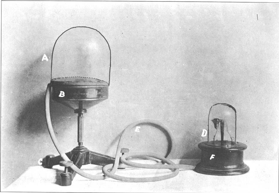 Telekinetoscope. 1. A, glass shade covering; B, brass cup sealed by means of soap film; C, stand, with levelling screws; D, red light indicator, hermetically sealed by glass shade; F, wooden base of indicator; E, heavily-insulated rubber cable connecting transmitter and indicator p.326