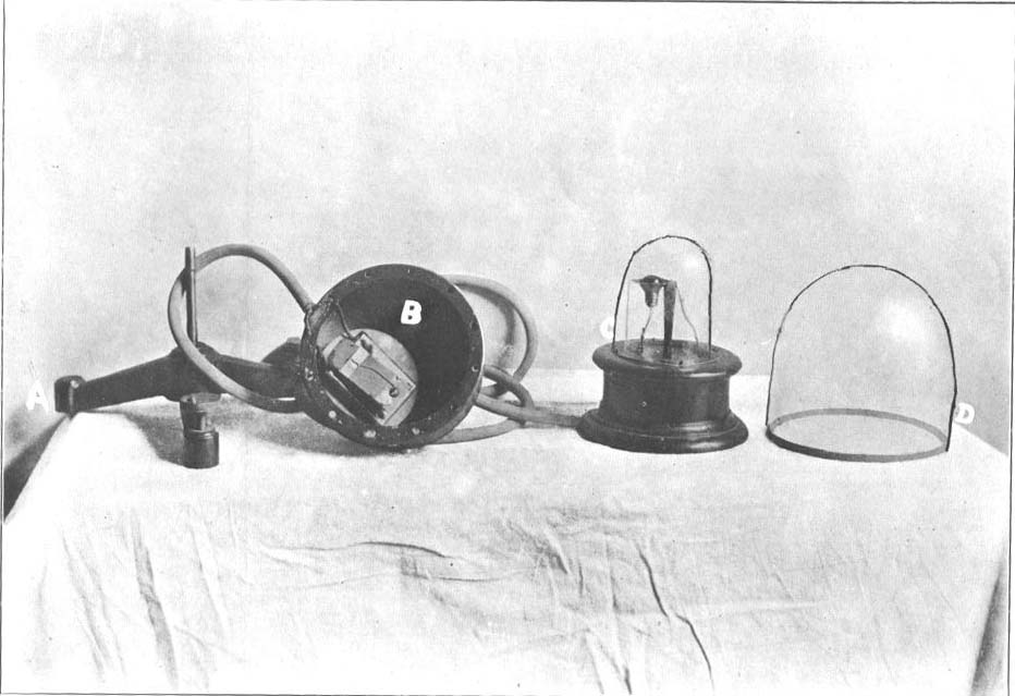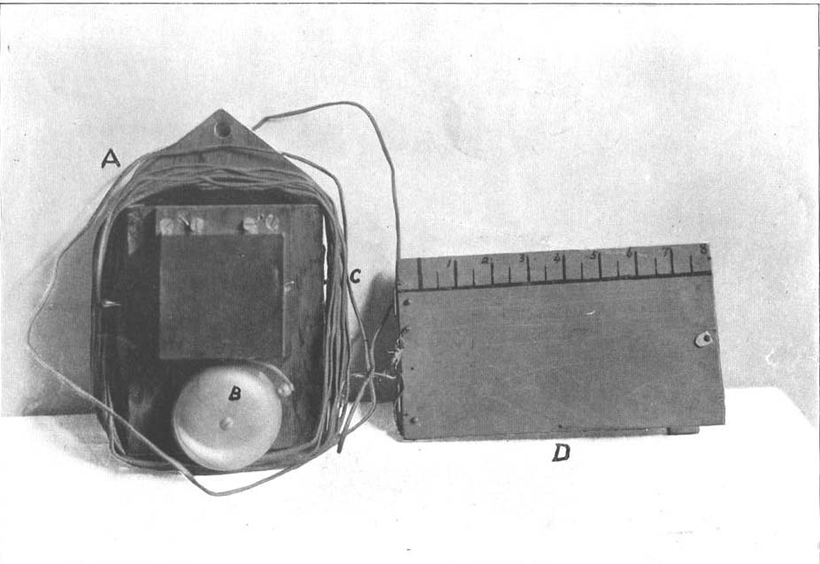 Telekinetoscope. 2. A, stand of transmitter; B, brass cup of transmitter, (showing insulated contact-maker in situ), which is sealed by means of soap bubble or film; C, insulated red light indicator on wooden base; D, glass shade covering brass cup and protecting soap film. p.327