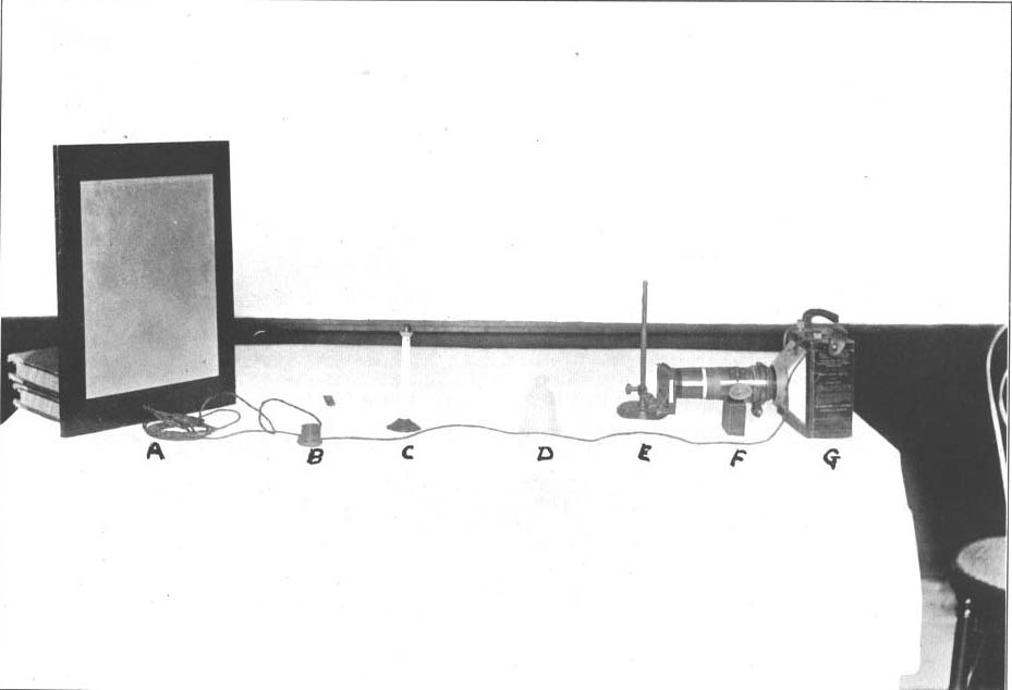 Shadow Apparatus A, luminous screen; B, table control switch; C, and D, trumpet and bell placed in the pencil of light; E, Wratten ruby filter in holder; F, Zeiss telephoto lens used as projector, connected with lamp and battery G. p.334