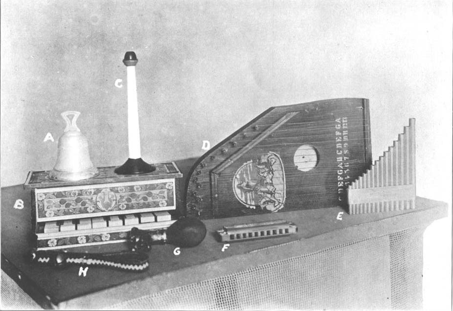 Musical Toys A, aluminium bell; B, piano; C, celluloid trumpet; D, auto-harp; E, Pan pipes; F, mouth-organ; G, rubber dog squeaker; H, rattle bells. All these objects were operated upon by unseen psychic forces. p.325
